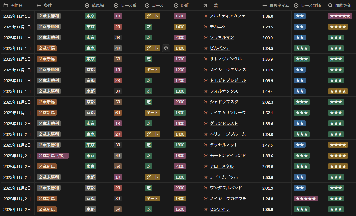 2025年11月1日~2日 2歳新馬・未勝利戦全レースの勝ち馬と評価