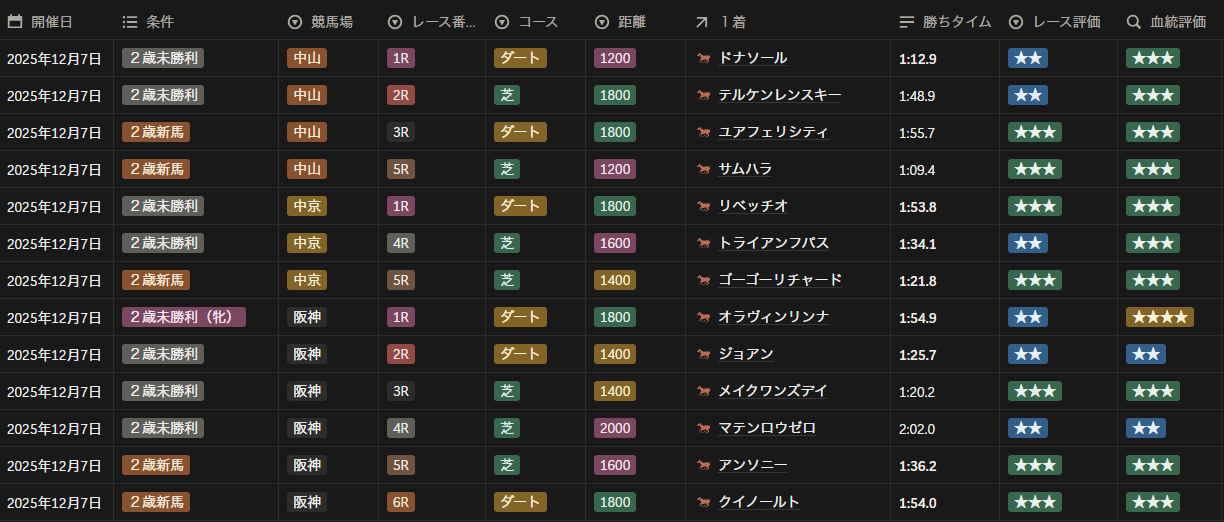 2025年12月7日 2歳新馬・未勝利戦全レースの勝ち馬と評価