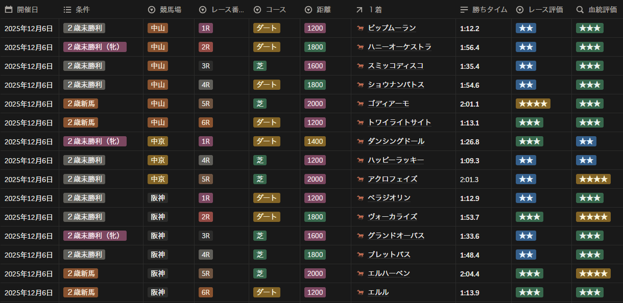 2025年12月6日 2歳新馬・未勝利戦全レースの勝ち馬と評価