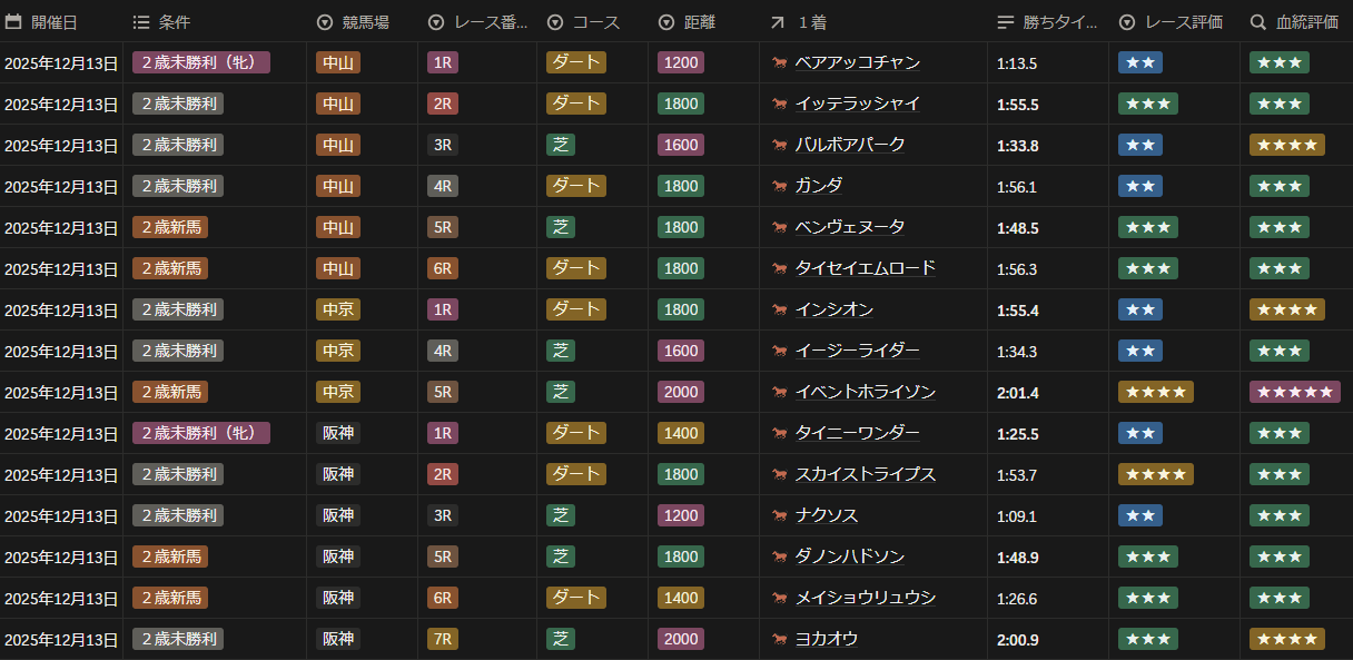 2025年12月13日 2歳新馬・未勝利戦全レースの勝ち馬と評価