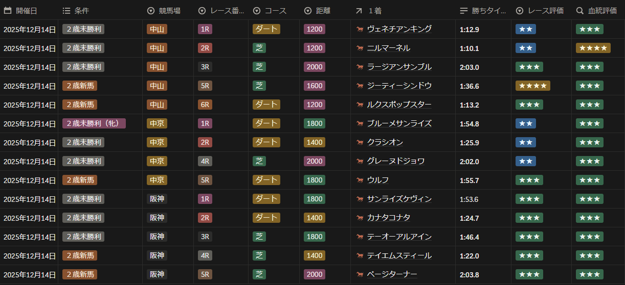 2025年12月14日 2歳新馬・未勝利戦全レースの勝ち馬と評価