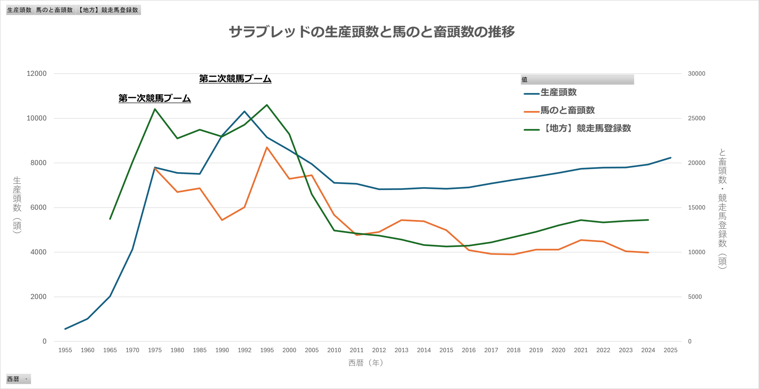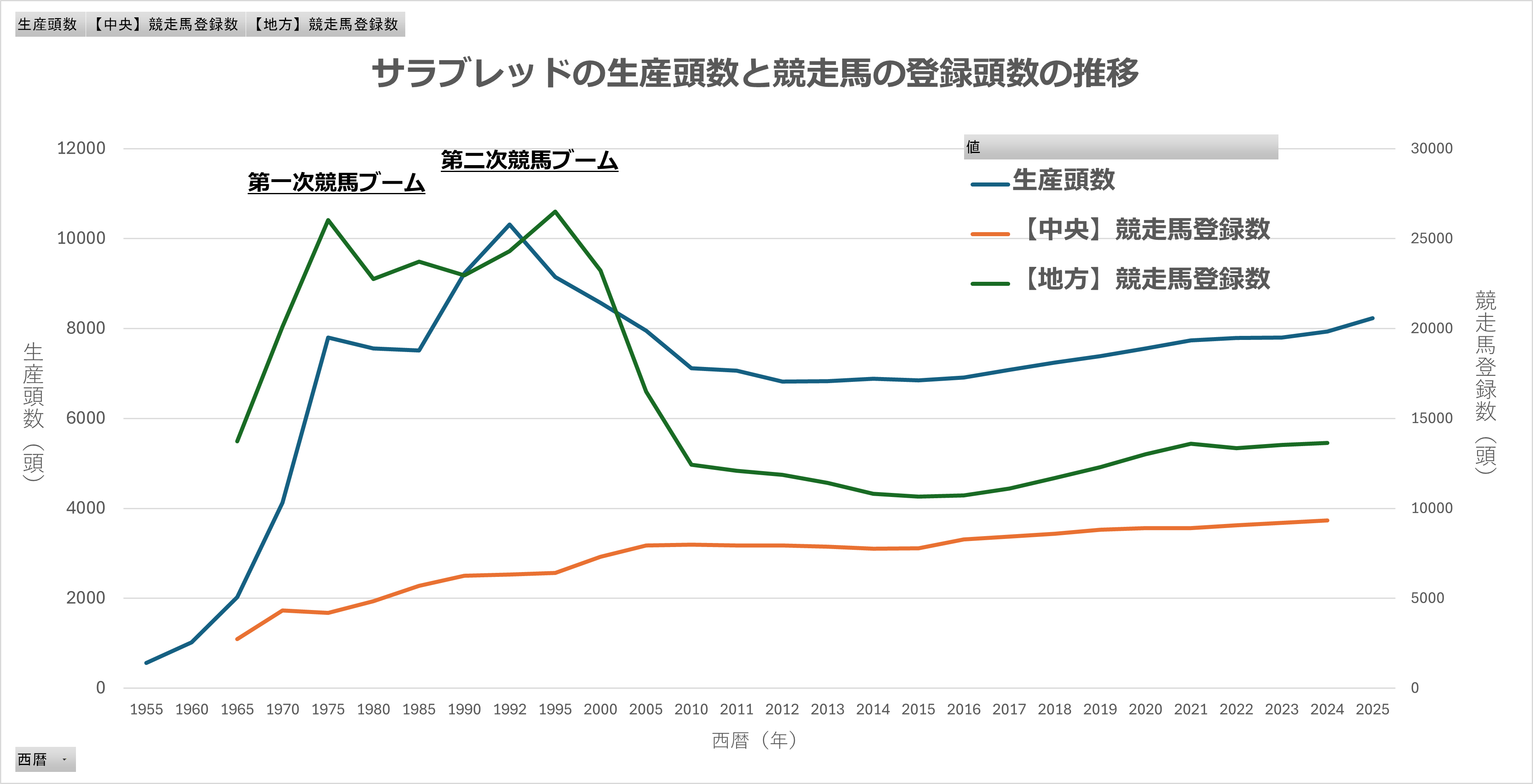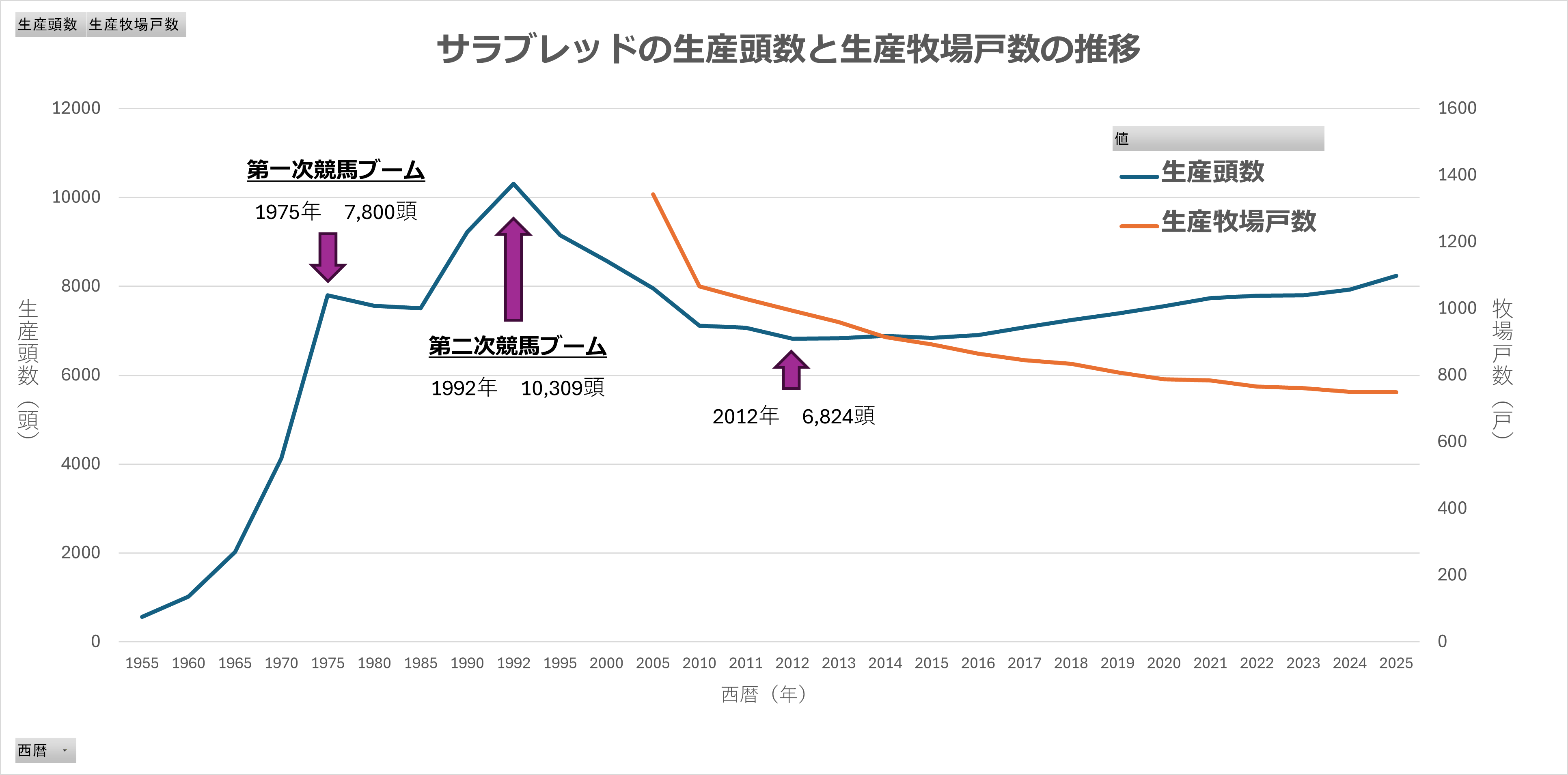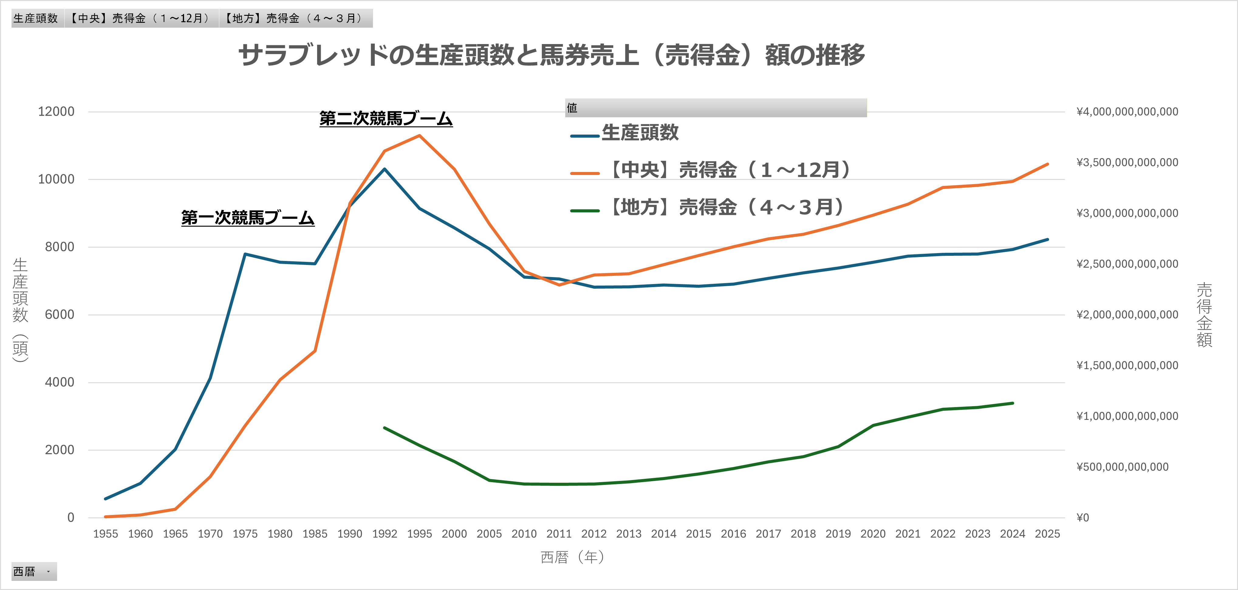 すでにお気づきかもしれないが、サラブレッド生産あるいは競馬ブームというのは、世の中の経済状況や景気の影響を少なからず受けていると考えられる。