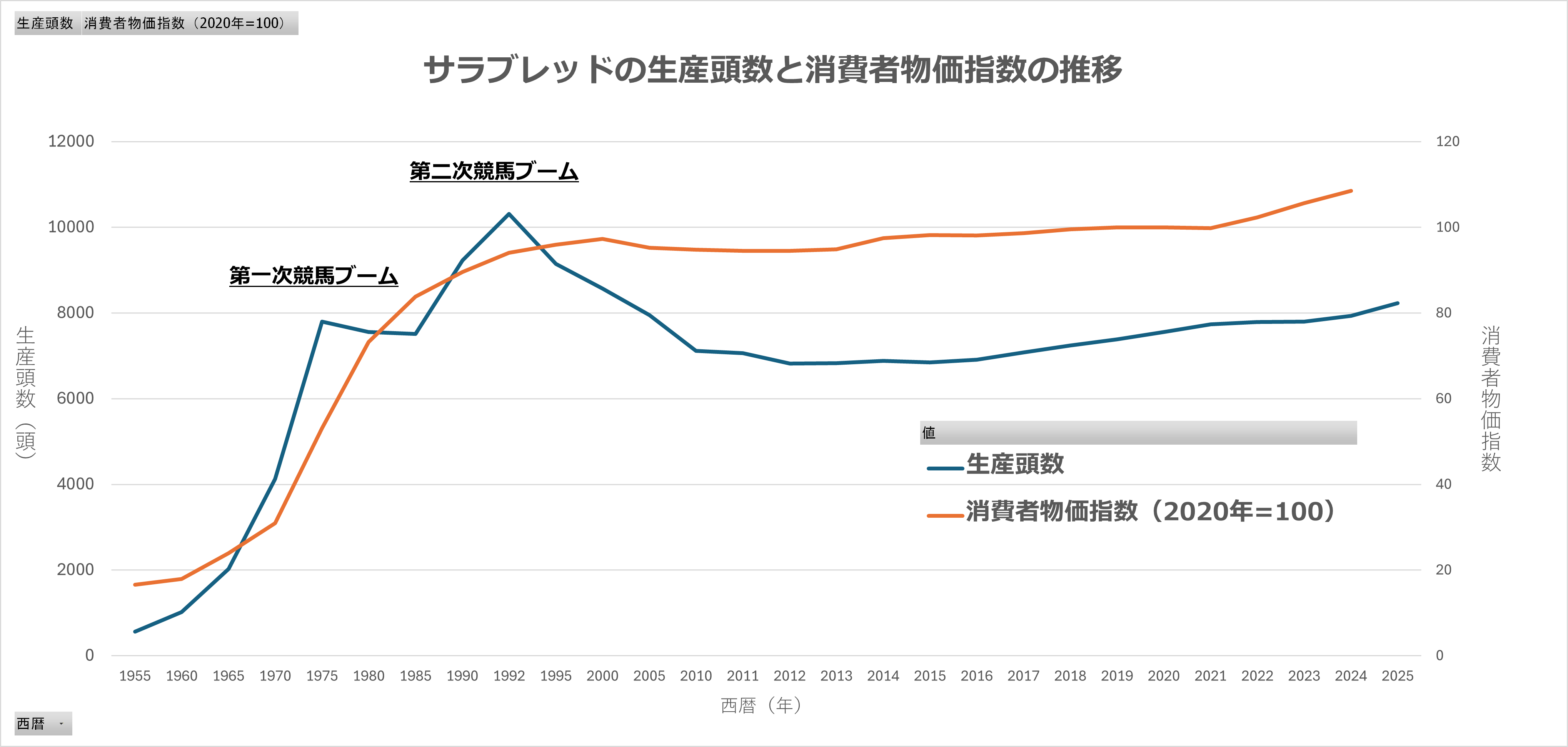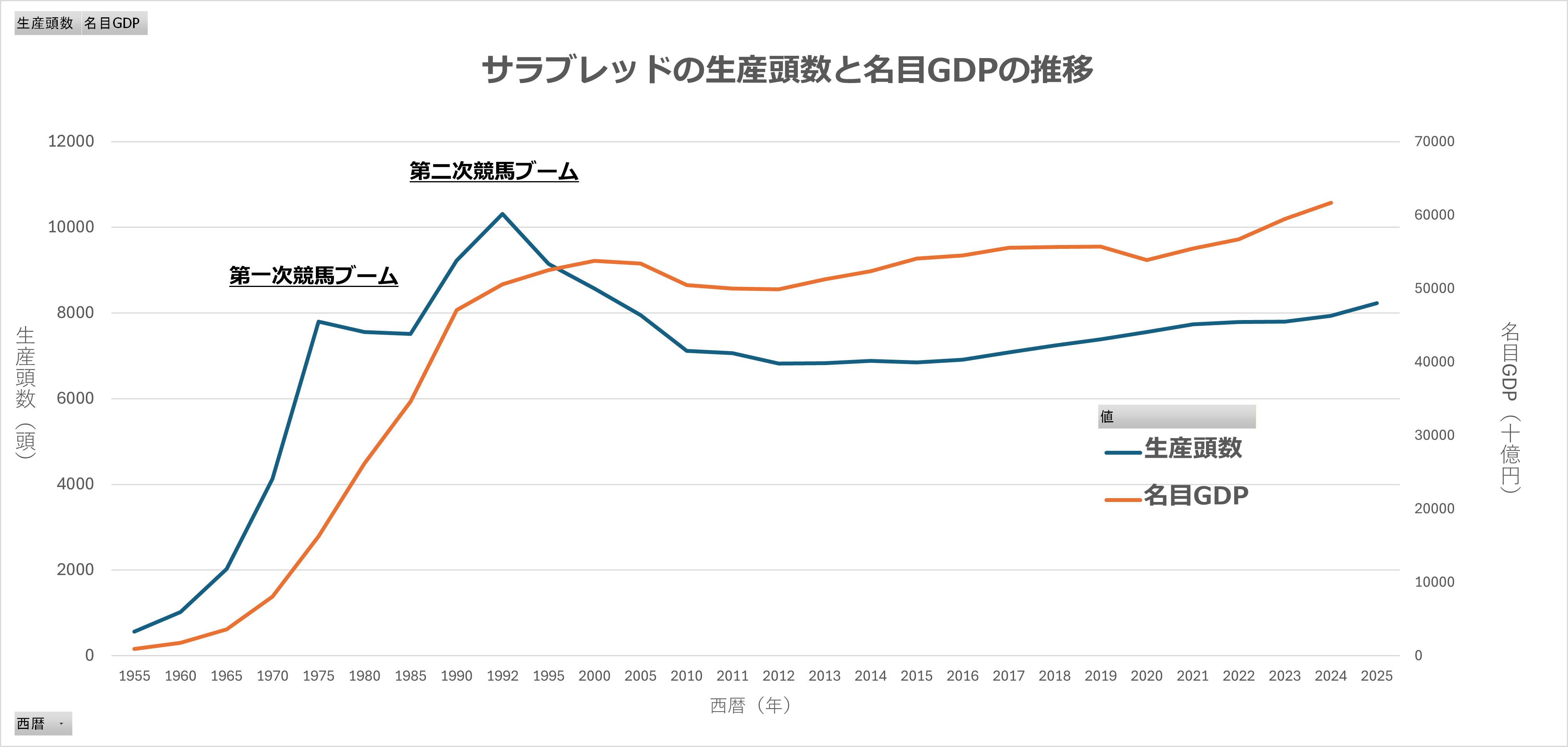 「卵が先か、鶏が先か」という議論はいったん置いておいて、一般的な経済指標の推移とサラブレッドの生産頭数の推移を見比べてみよう。